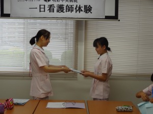 | 鈴木看護部長の挨拶と看護業務についての説明 | 任命状とタスキを受け取りいよいよ体験開始 |