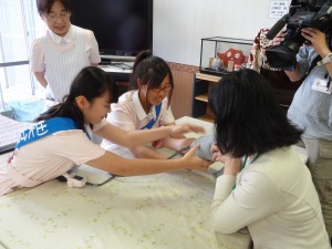 | 血圧測定体験。血圧は身近で大切な体のバロメーターです。 ちゃんと測れたでしょうか? |